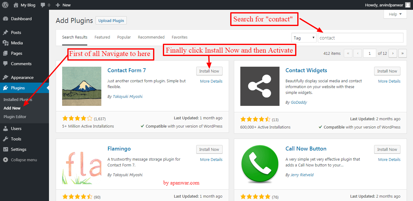 To install this plugin you should navigate to Plugins in your Dashboard and then Add New. Then write the “contact” in the search box and, WordPress will show you the related results automatically. From here you can install the Contact Form 7 plugin and then Activate this plugin.